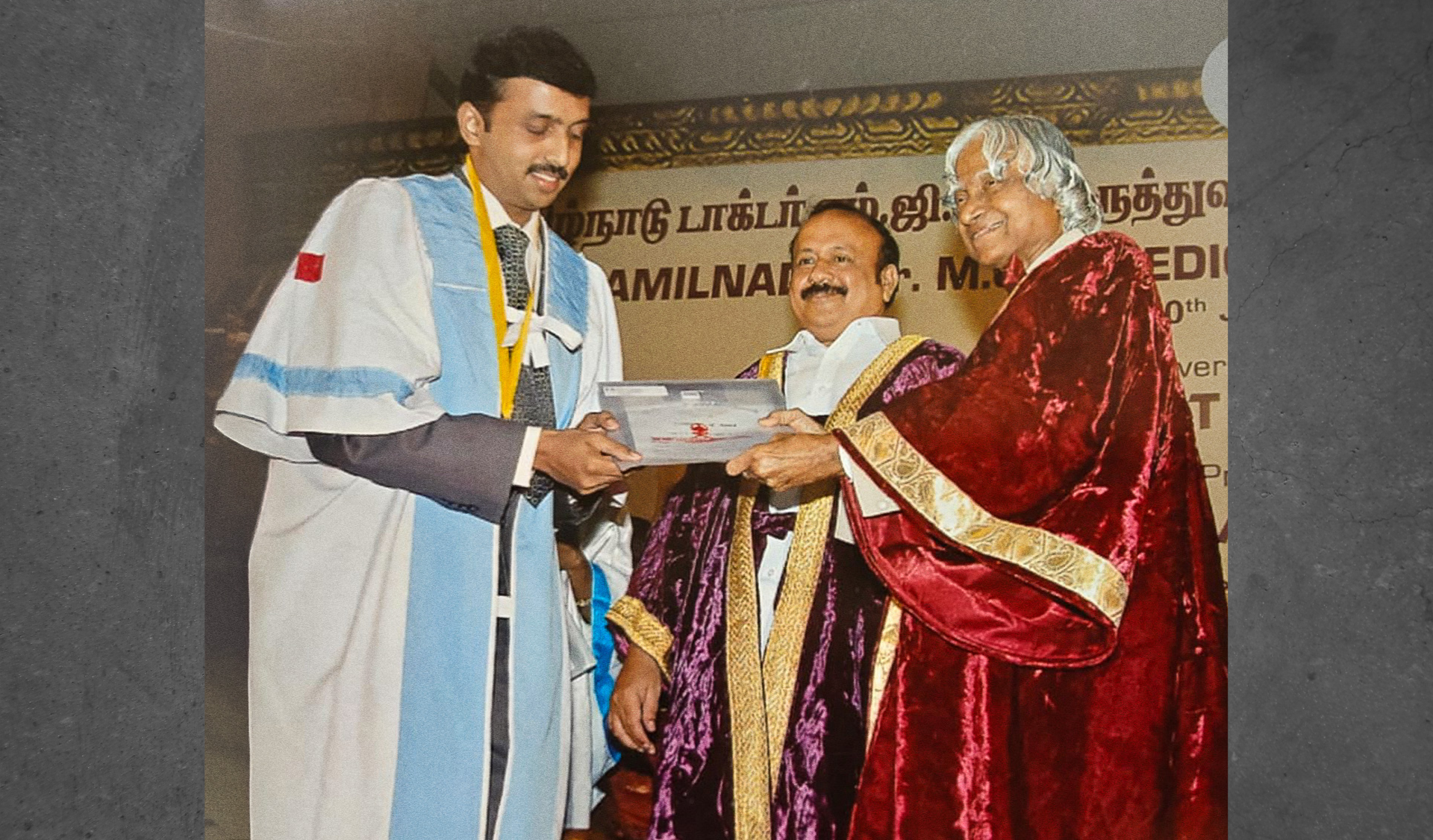 Dr. Arun completed his MBBS from Government Medical College, Thrissur, and pursued his MD in Internal Medicine from Government Medical College, Calicut. He trained in Medical Oncology at the prestigious Adyar Cancer Institute, Chennai, where the intense clinical work and discipline shaped his foundation in oncology. His efforts culminated in being awarded the University Gold Medal for Medical Oncology by Dr. A.P.J. Abdul Kalam, one of his proudest academic moments.